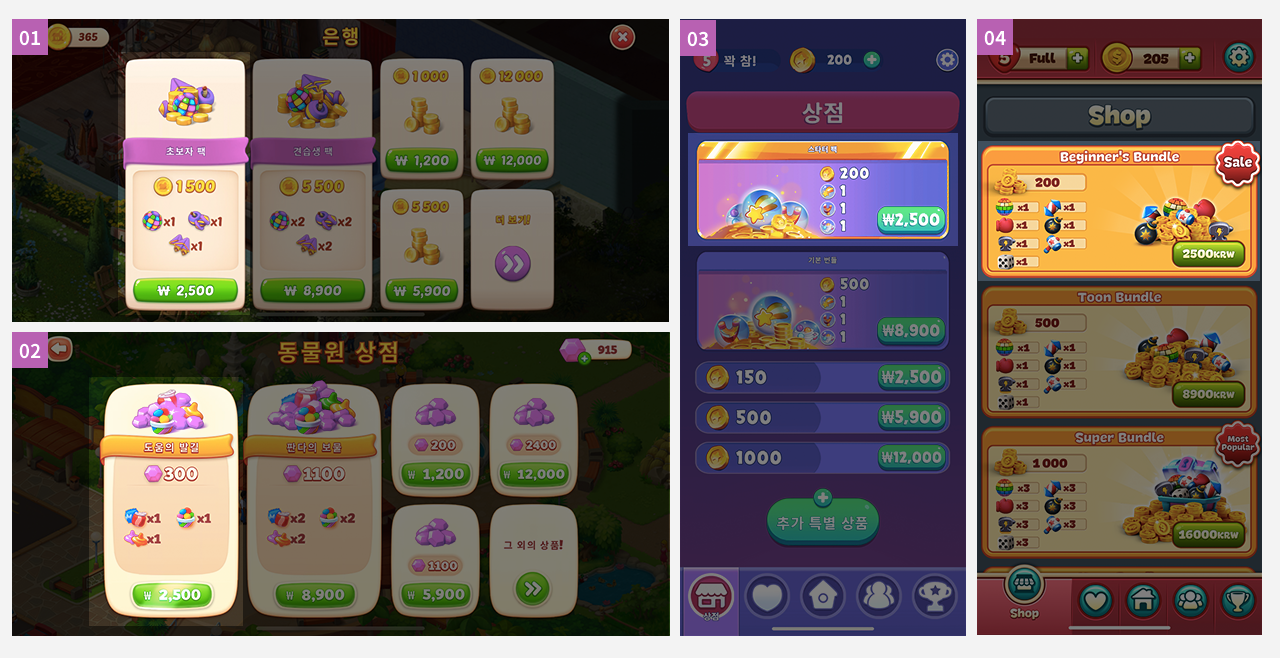 모바일 캐주얼 게임과 같이 유저의 가벼운 결제를 유도하는 게임에서는 특히 스타터 번들 류와 같은 최저가 상품의 역할이 매우 중요합니다. 스타터 번들류 상품은 대체로 전체 번들 상품 중 가장 저렴하고 가장 효율이 좋은 상품으로 *유저당 단 한 번만 결제할 수 있도록 디자인되어 있습니다. 캐주얼 게임의 경우 스타터 번들을 통해 유저들이 가볍게 인앱 결제의 첫 발을 내딛도록 유도하고, 결제 후 해당 상품이 없어지고 나면 점차 더 비싼 상품을 결제하도록 유도하는 미끼 상품의 역할을 합니다.