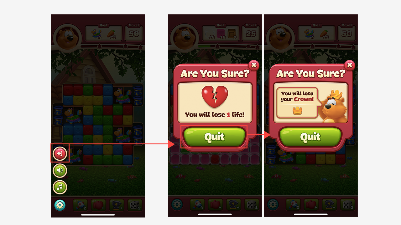 유저가 레벨 플레이를 중단하지 못하게 하여 코어 플레이 루프[7]에 계속 머물게 하는 장치로써 그만하기(Quit) 팝업에서도 유사한 정보를 제공하기도 합니다. 툰 블라스트뿐만 아닌 다양한 모바일 퍼즐 게임에서 유저가 게임 플레이 도중 그만하기 버튼을 터치하면, 해당 레벨의 플레이를 위해 소비한 행동력(하트)을 낭비하는 것처럼 느끼게 만들거나, 이어하기와 마찬가지로 각종 이벤트 진행 정보, 연승 정보 등을 보여주며 지금 그만두면 손해 볼 수 있다고 유저를 또 위협합니다.