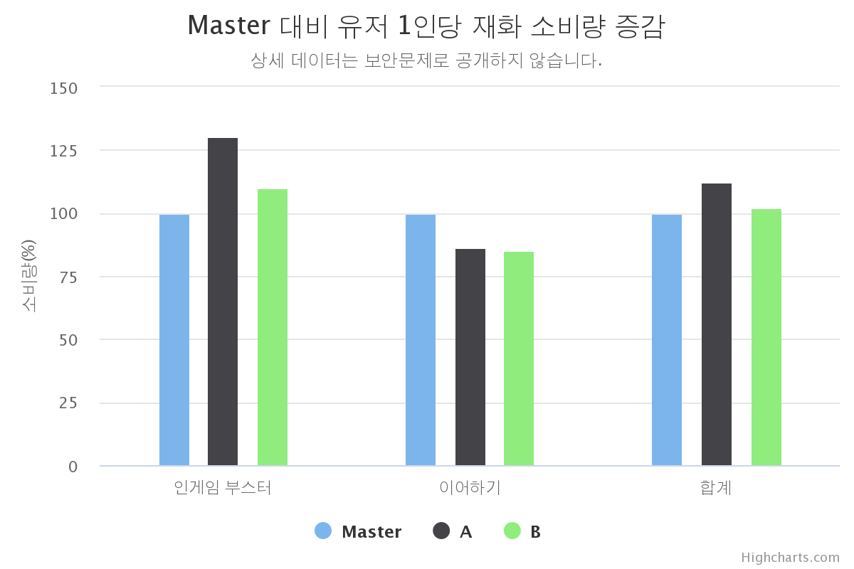 다만 한 가지 주의해야 하는 점은, 유저 1인당 인게임 부스터 소비량이 오르면서 동시에 유저 1인당 이어하기(Continue) 소비량은 하락했다는 사실이다. 이어하기 측면에서는 Master세트에 비해 A나 B세트에서 소비량이 약 14~15% 하락했다. 다행히 인게임 부스터+이어하기 소비량 합계는 A세트와 B세트가 Master세트에 비해 각각 12%, 2%가량 높다. 다만 이어하기에서 손해가 있었던 만큼 조심스럽게 디자인하고 지표를 추적해 볼 필요가 있다. 어쨌든 퍼즐 장르에서 가장 주요한 매출 지면은 이어하기니까 (이어하기 소비량 실험은 다른 글에서 소개하기로..).