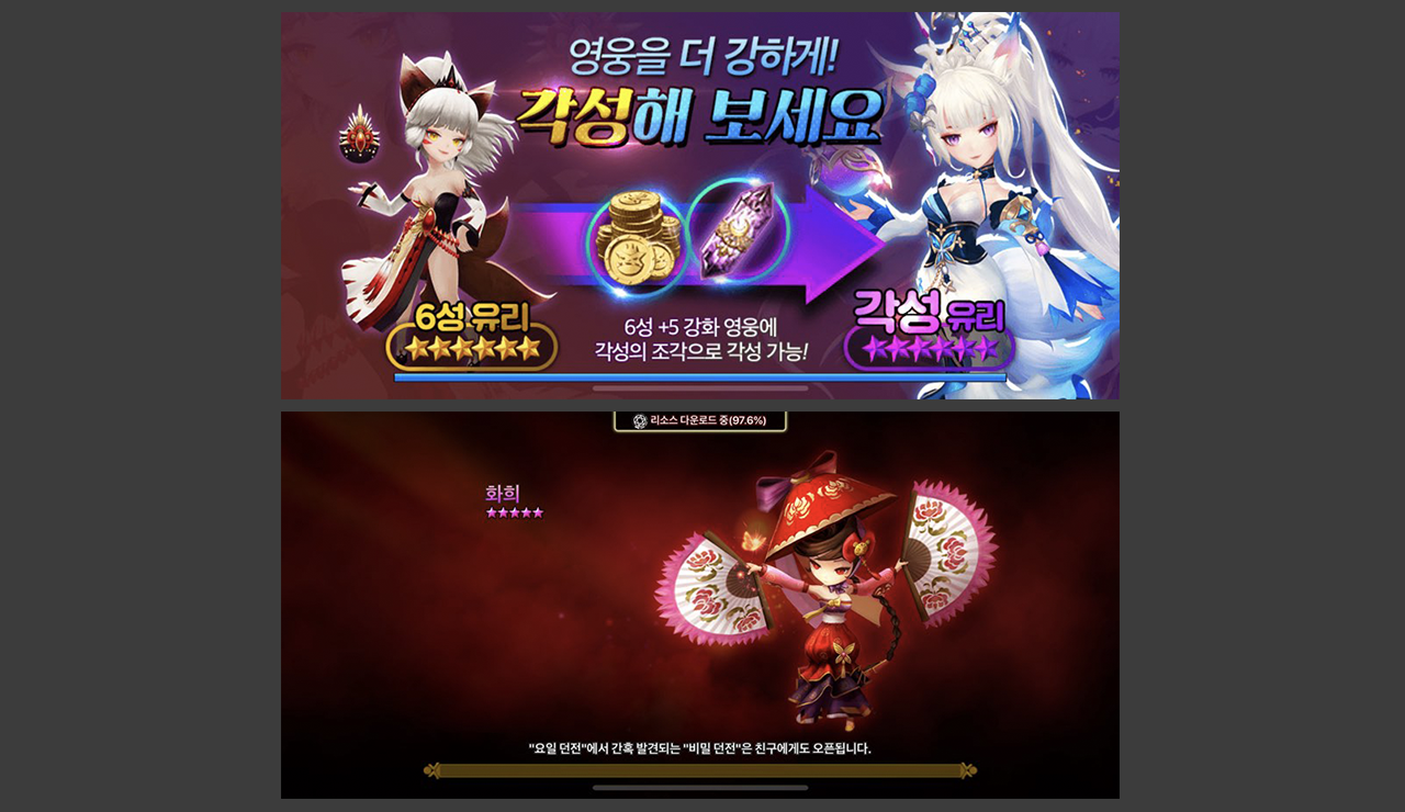 1. 가장 먼저 떠올린 방법은 로딩 트랜지션이다. 이전에 미드코어 장르(디펜스) 프로젝트에서 로딩 트랜지션 지면을 디자인했는데 주로 인게임 아이템 사용이나 유닛 강화 팁, 신규 가차 상품 등을 프로모션 해서 활성화시키는 것이 목표였다. 아쉽게도 지면의 효과를 실제 데이터로 측정해본 적은 없었지만, 유저에게 반복적으로 보여주는 지면인 만큼 신규 출시하는 가차 상품이나 강화-각성 콘텐츠를 세심하게 선정하고 꽤 중요하게 다루었던 기억이 있다.