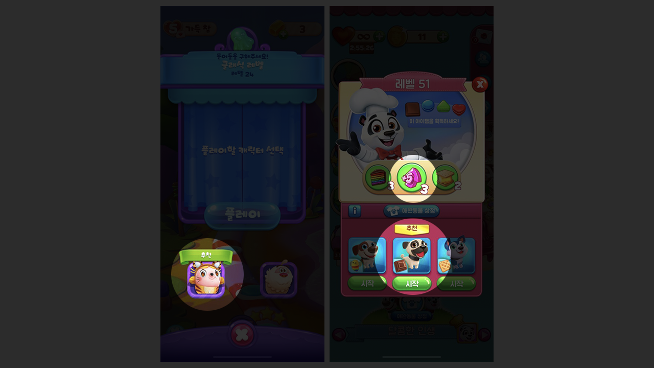 실험 설계에 캔디 크러시 프렌즈 사가와 쿠키 잼의 UI를 레퍼런스로 참조했다. 다만 캔디 크러시 프렌즈 사가는 준비 부스터를 추천하지 않는다. 정확히는 게임에 준비 부스터 개념이 없고 대신에 고유 능력을 지닌 캐릭터를 선택할 수 있다. 쿠키 잼도 마찬가지다. 두 게임은 특정 레벨이나 미션을 클리어하는데 도움이 되는 캐릭터 사용을 유도하기 위해 캐릭터 선택 UI에 추천 배지를 표기한다. 쿠키 잼은 여기에 준비 부스터까지 제공한다. 레벨 디자인과 미션 특성에 따라 유용한 준비 부스터가 있는 경우 스케일 업-다운되며 흔드는 애니메이션 연출을 보인다. 추천 배지와는 다르지만 특정 준비 부스터 사용을 유도하는 목적임은 분명하다. 단, 두 게임에서 캐릭터 추천 배지나 사용 유도 연출을 보려면 유저가 추천 대상 캐릭터나 부스터를 보유하고 있어야 한다는 전제 조건이 있다.