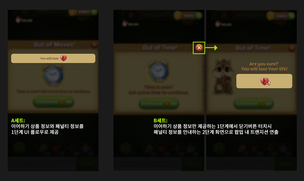 2. A세트는 이어하기 팝업에서 닫기 버튼 터치 시 하트에 대한 페널티 정보를 1단계 UI 플로우로 제공.