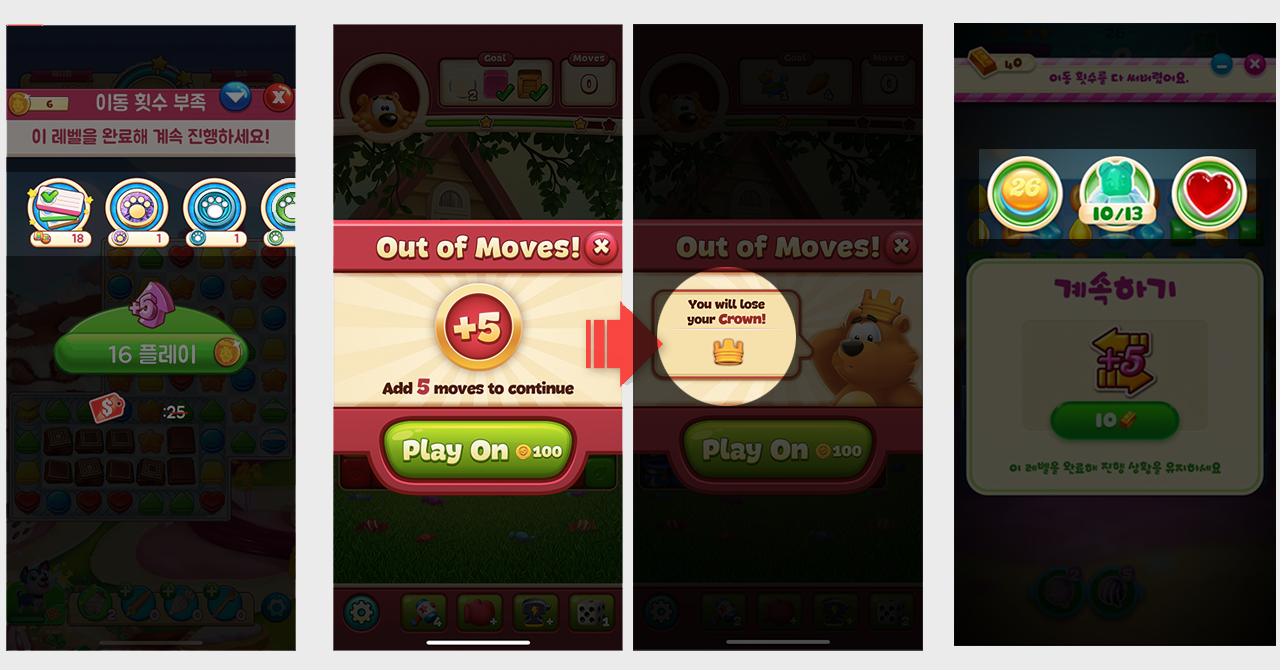 퍼즐 게임 개발자라면 아마 거의 모든 매치 장르 퍼즐 게임에서 이어하기(Continue)가 게임 재화 소비의 대부분을 차지한다는 것을 알고 있을 것이다. 이번 실험은 유저의 이어하기 구매 비율을 높이기 위한 실험이다. 모바일 게임의 손실 회피 편향 편에서 소개한 것처럼 유저가 이어하지 않았을 때 잃을 수 있는 각종 페널티 정보를 인지시켜 손실 회피 편향을 자극하는 것이 핵심이다.