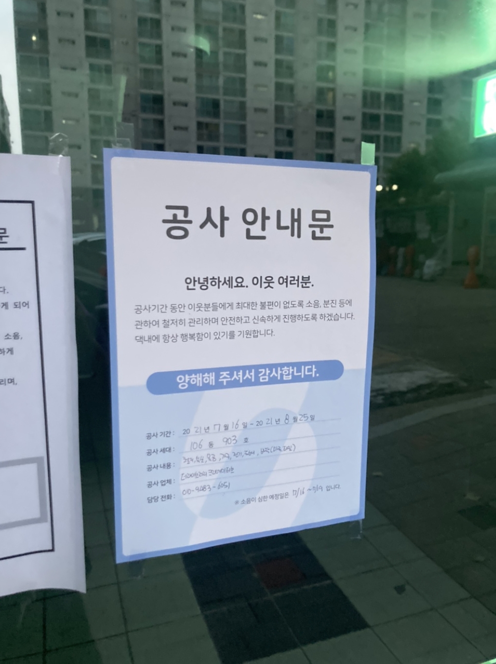 공사 시작 전 구청에 제출해야 하는 구조변경 신고나 아파트 이웃 주민에게 받아야 하는 인테리어 공사 동의서, 엘리베이터와 공사 자재 이동 경로 보양은 페어 피스[5]라는 스타트업에 의뢰했다. 인테리어 업체에서도 대행해주긴 하지만, 페어 피스의 시스템이나 비주얼이 훨씬 세련되고 프로페셔널하게 느껴졌다.